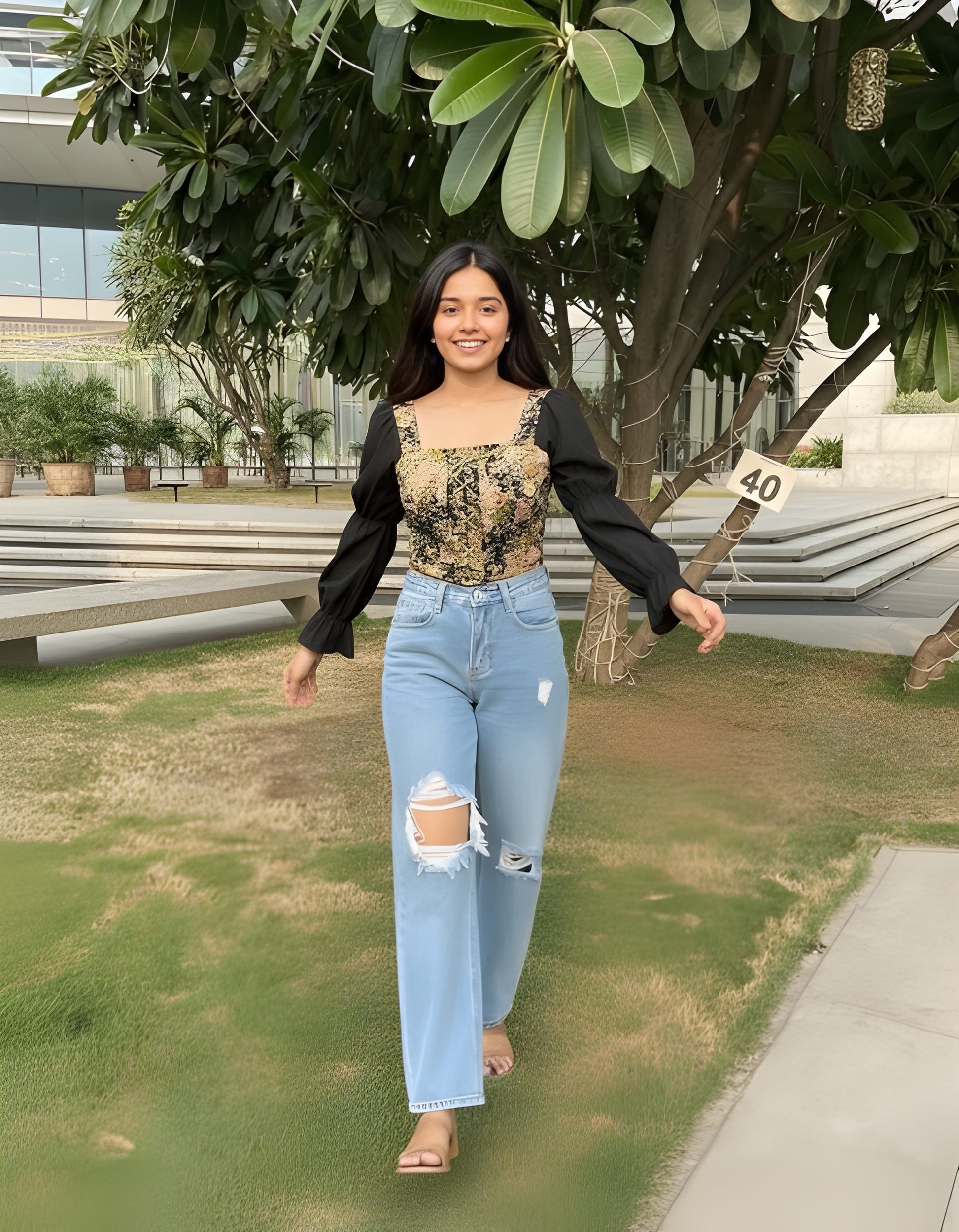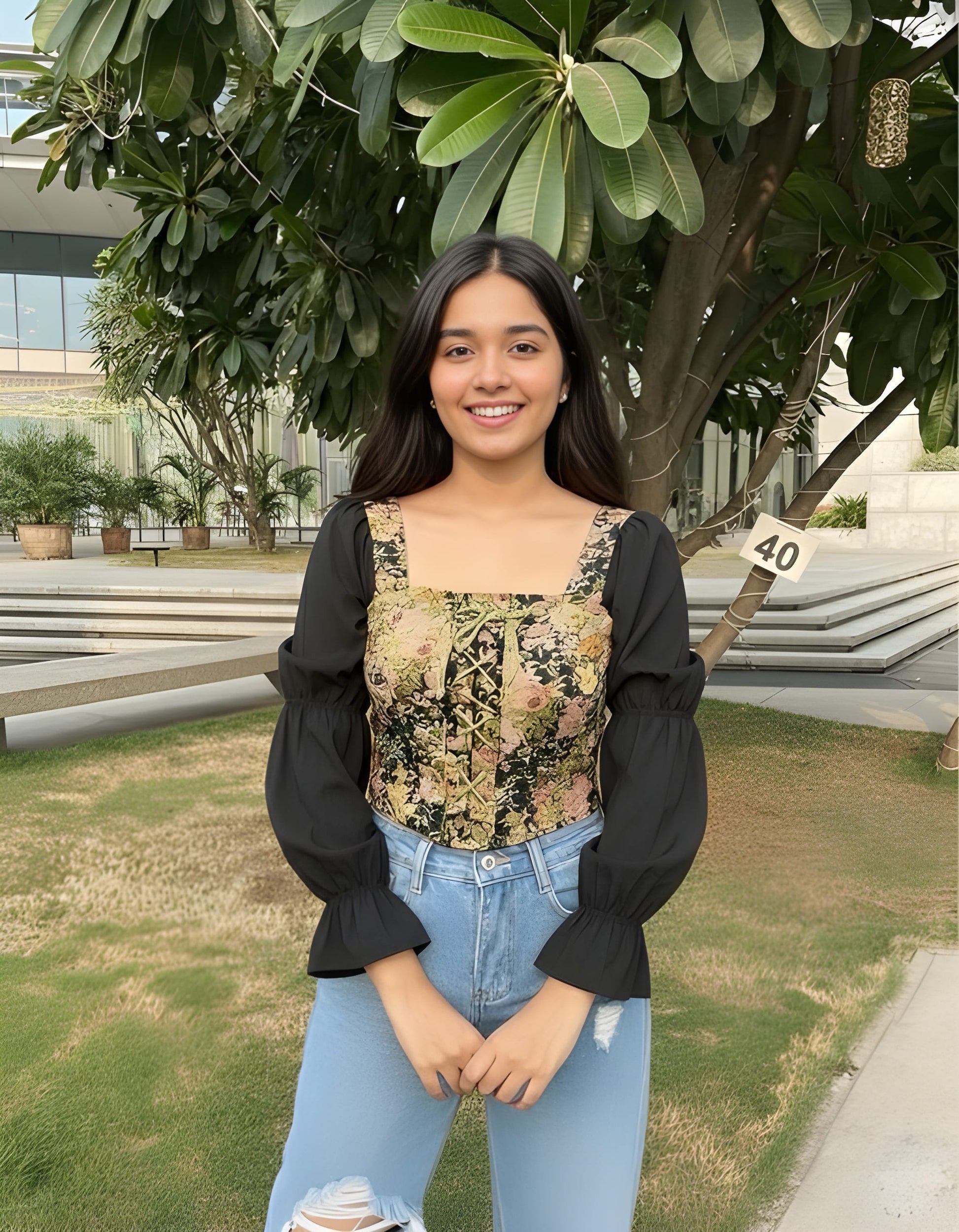 This top is the ultimate blend of romantic vintage and modern chic! The centerpiece is a beautifully structured brocade corset panel with a delicate floral tapestry design and adjustable lace-up detailing. This is perfectly contrasted with dramatic, voluminous puff sleeves in a solid black, giving it a high-fashion, yet wearable look.