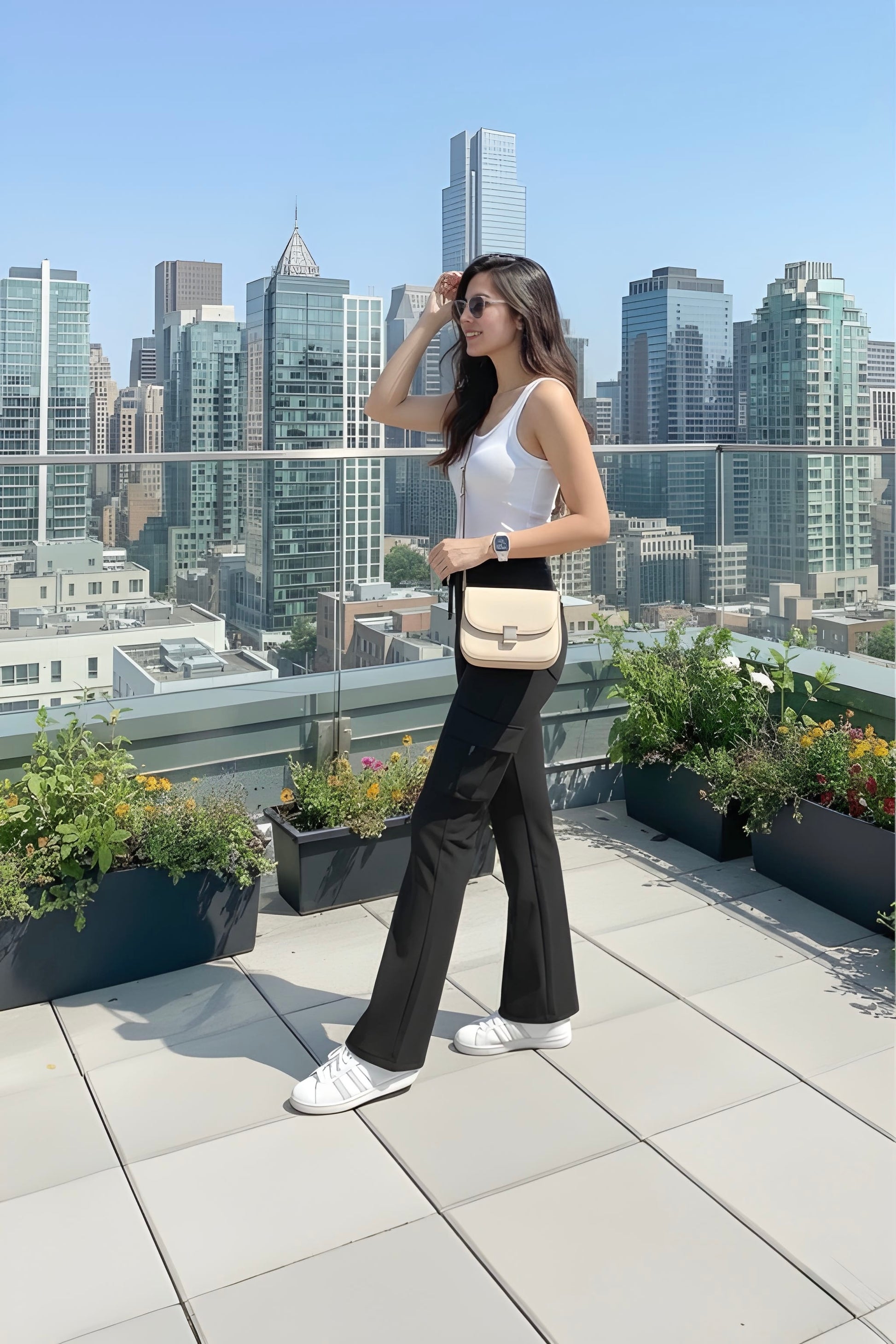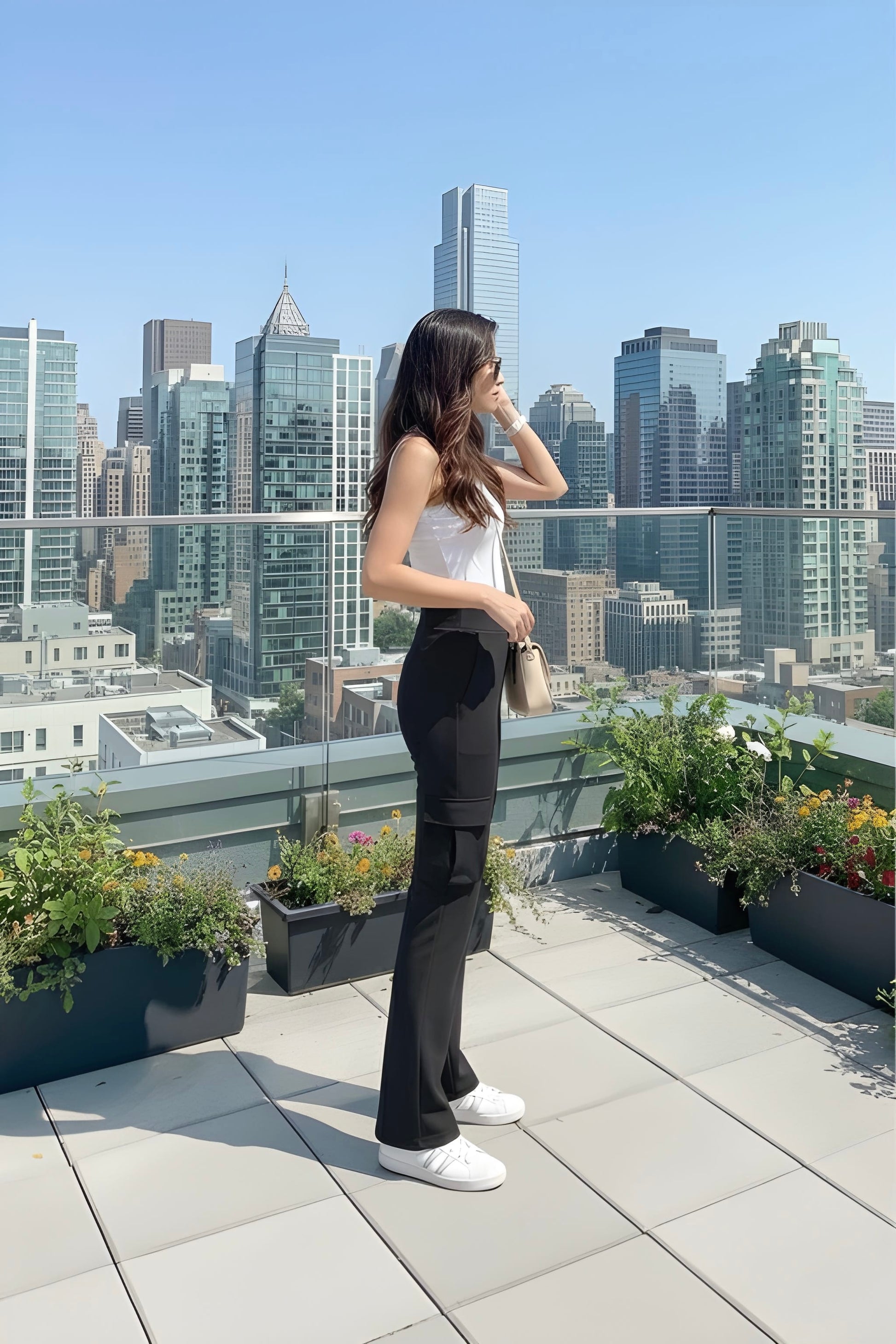 The classic cargo pockets on the thigh are streamlined for a chic look, flowing into a subtle straight-leg or slight flare. Styled here with a simple white tank and sneakers, they're perfect for work, travel, or an effortless weekend look. Comfort never looked so good!