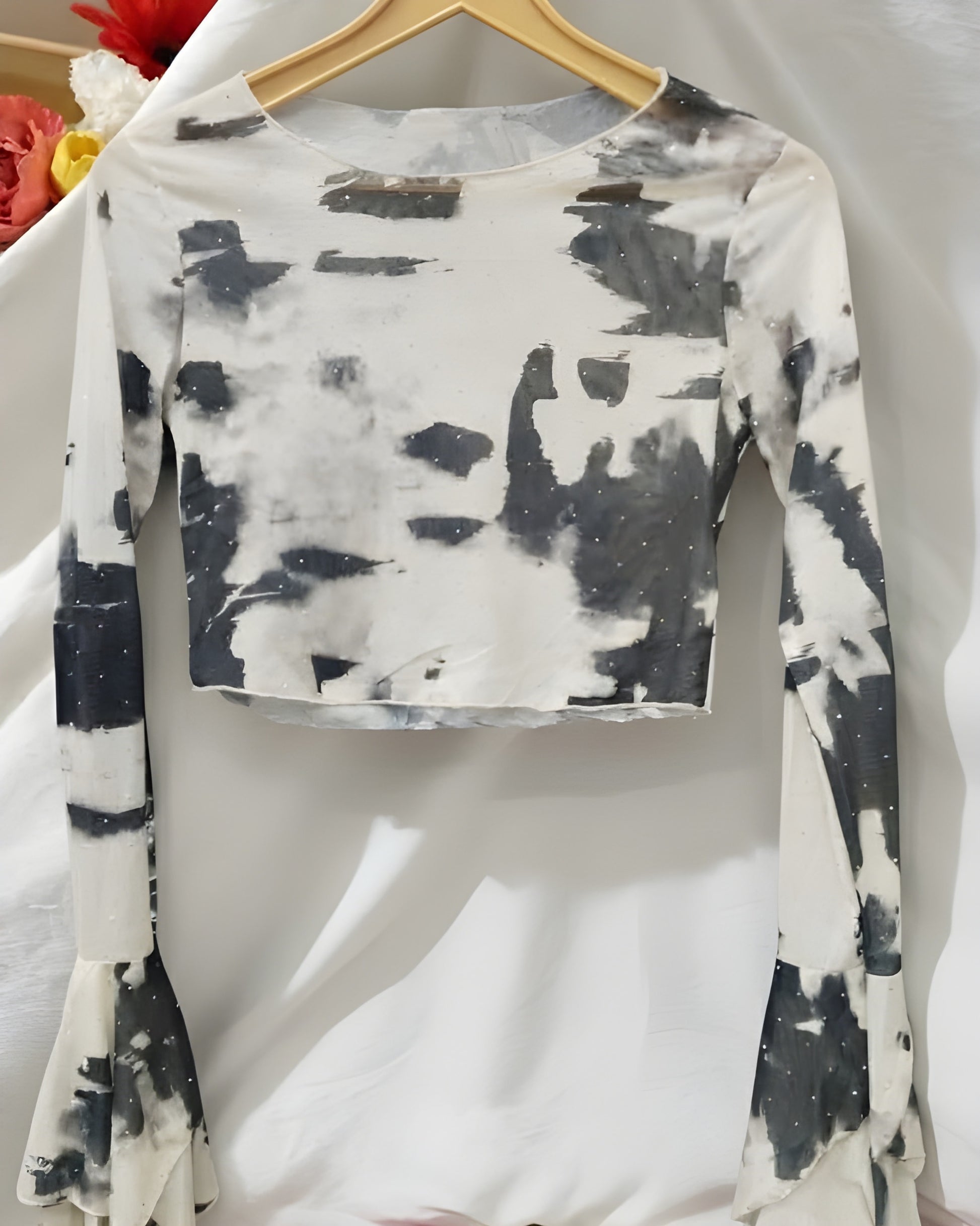 Meet the Cloud Dye Crop Top—the ultimate upgrade to your casual wardrobe. This top features a bold, monochromatic tie-dye or abstract print that makes it a true statement piece. The soft, figure-hugging fabric is paired with a playful wavy/ruched hem and flattering long sleeves that flare slightly at the wrist.