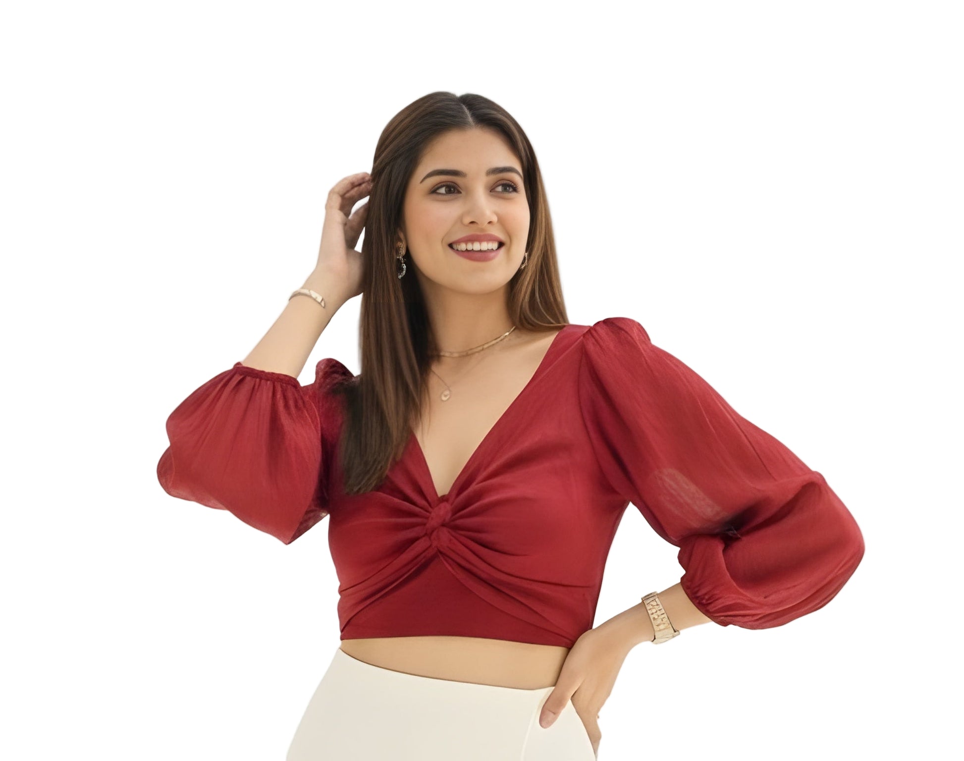 Effortlessly glamorous. This beautiful crop top features a flattering deep V-neckline created by a sophisticated twisted knot detail at the center front. The body is crafted from a soft, flowing chiffon-like fabric, complemented by voluminous sheer lantern sleeves with elastic cuffs. The wide band at the waist offers a cinched, supportive fit. Perfect for dinner dates, parties, or any event where you want to make a statement.