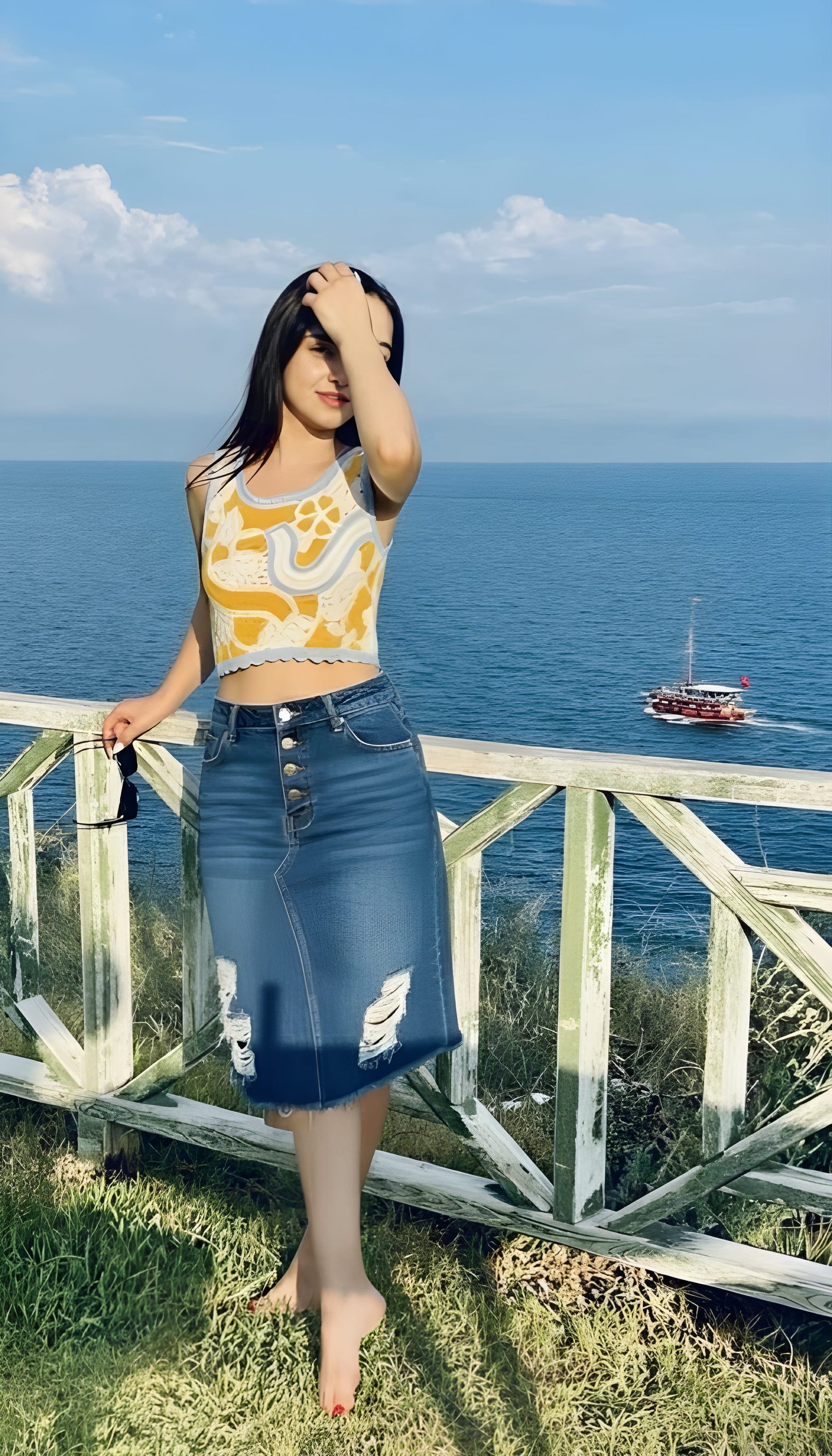 A true statement piece crafted for sunny days. This unique crop top features an intricate crochet lace overlay with bold, artistic cutouts revealing a vibrant yellow base underneath. The scoop neckline and scalloped hem are delicately trimmed in a soft baby blue, adding a charming contrast. The tank-style fit makes it perfect for pairing with high-waisted linen shorts, flowing skirts, or wide-leg trousers.