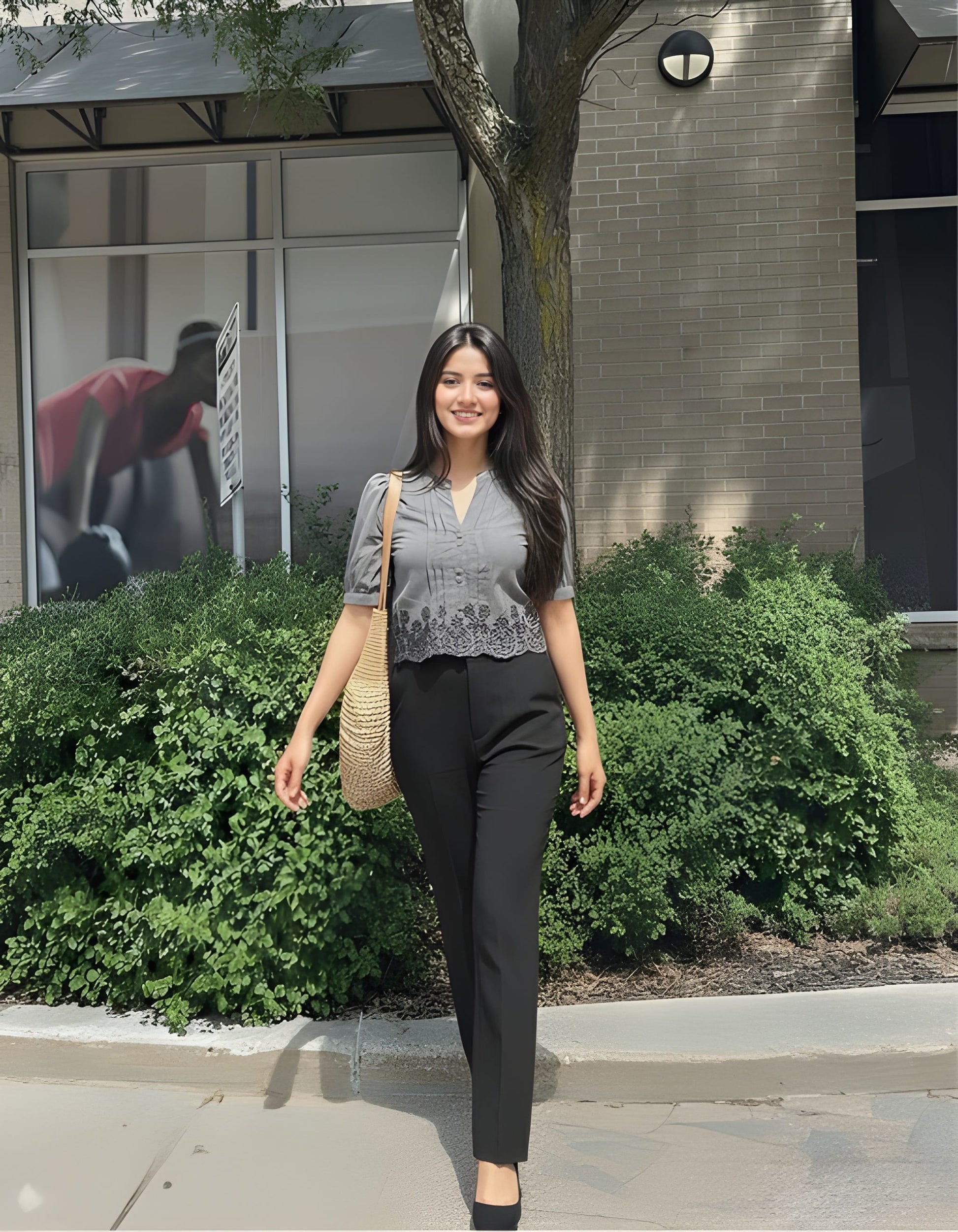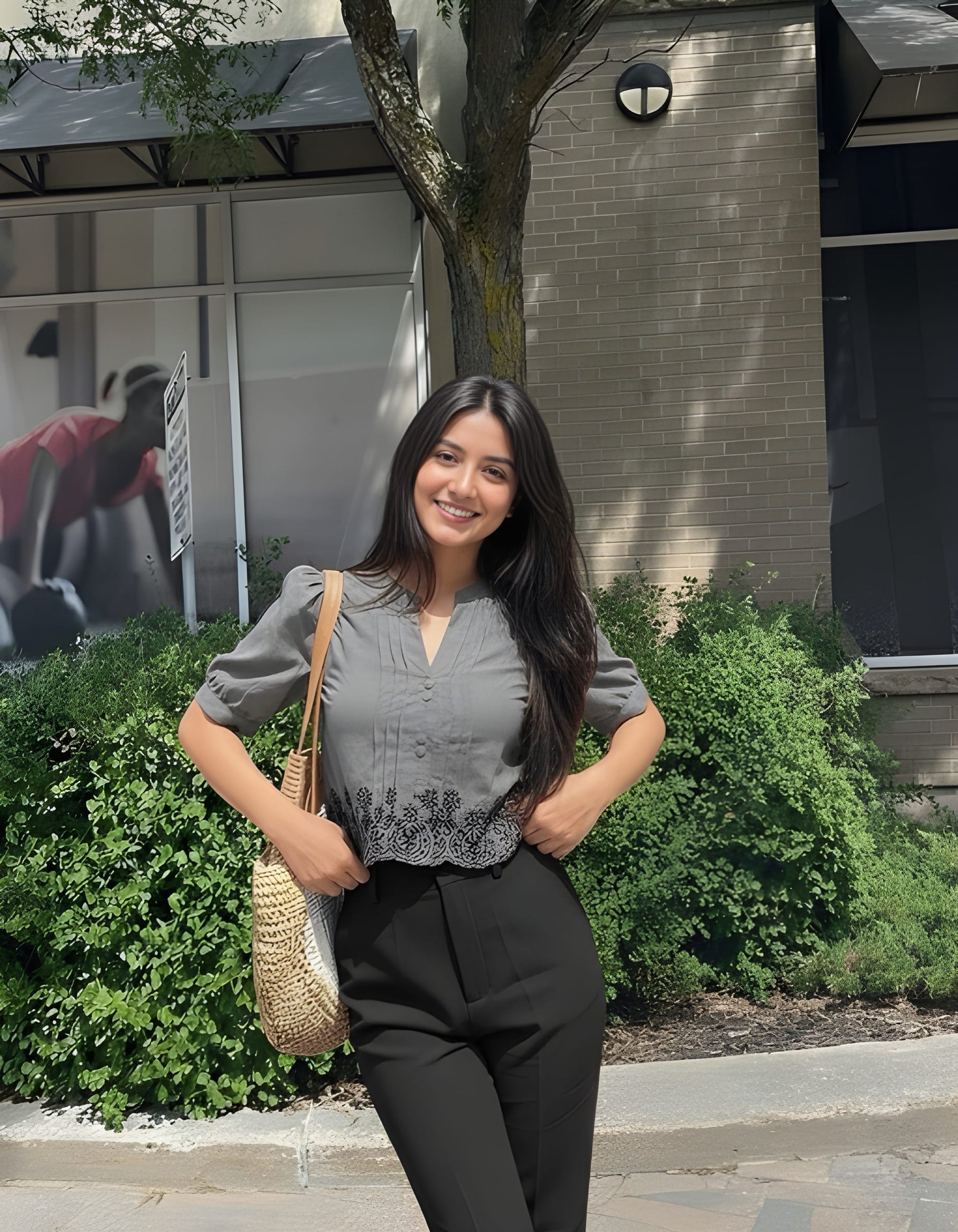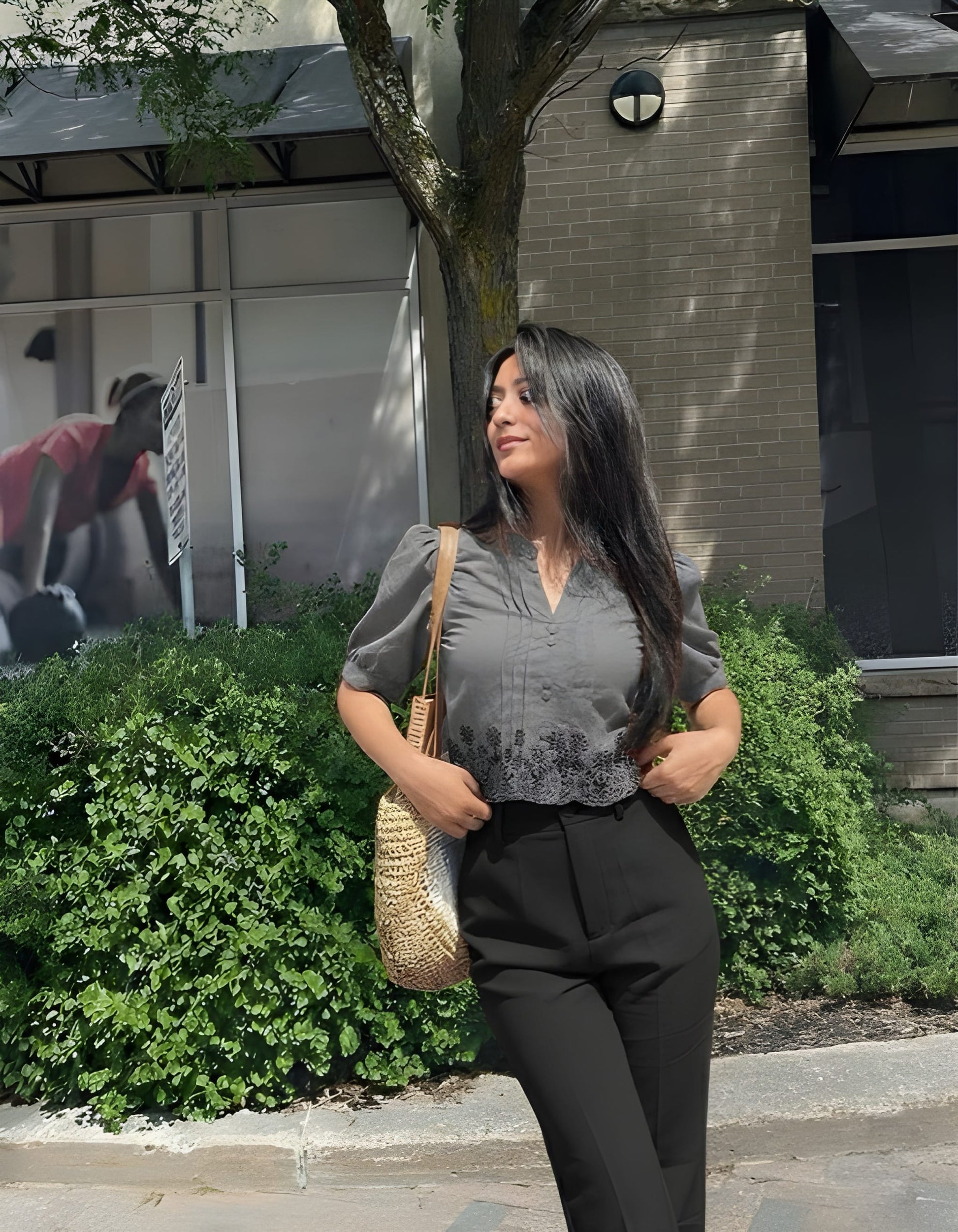 Discover timeless elegance. This beautiful blouse is crafted from a soft, flowing grey fabric and features intricate pintuck pleats down the front, creating a refined texture. The subtle V-neckline with a half-button placket adds a touch of classic charm. The hemline is adorned with striking black floral and medallion-inspired embroidery, giving it a unique, artisanal finish. With comfortable 3/4 sleeves, it's perfect for both professional and casual settings.