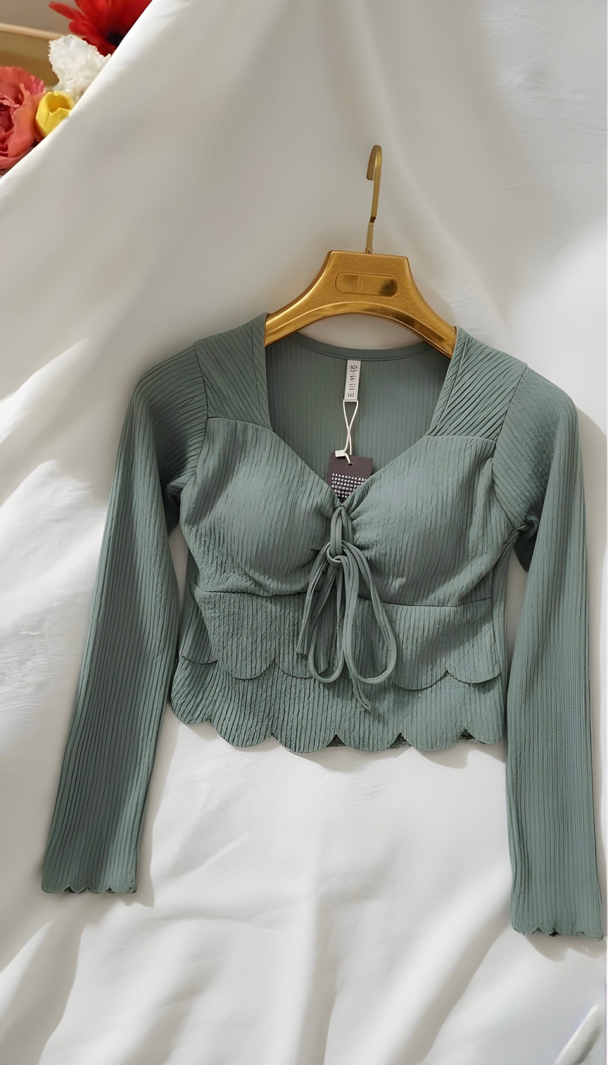 The soft, subtly ribbed fabric in a beautiful sage/mint green offers great stretch and comfort. The star of the show is the charming scalloped hemline, adding a whimsical touch. Pair it with high-waisted wide-leg jeans, cargo pants, or a simple mini skirt for an effortlessly stylish look.