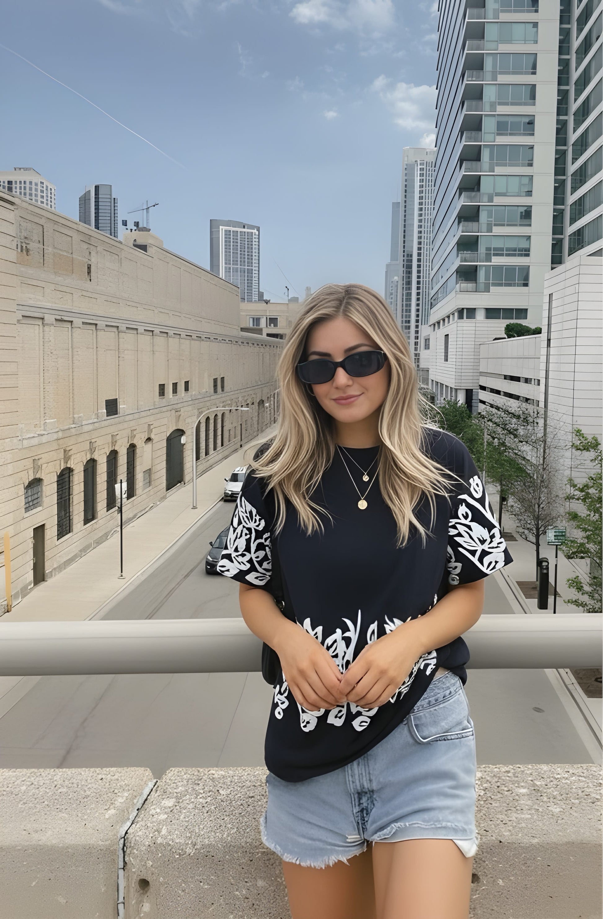 Own the street style scene in our "Urban Vine" Graphic Tee. This oversized black t-shirt features a striking white botanical/vine print across the chest and sleeves, giving a fresh, contemporary edge to the classic graphic tee.